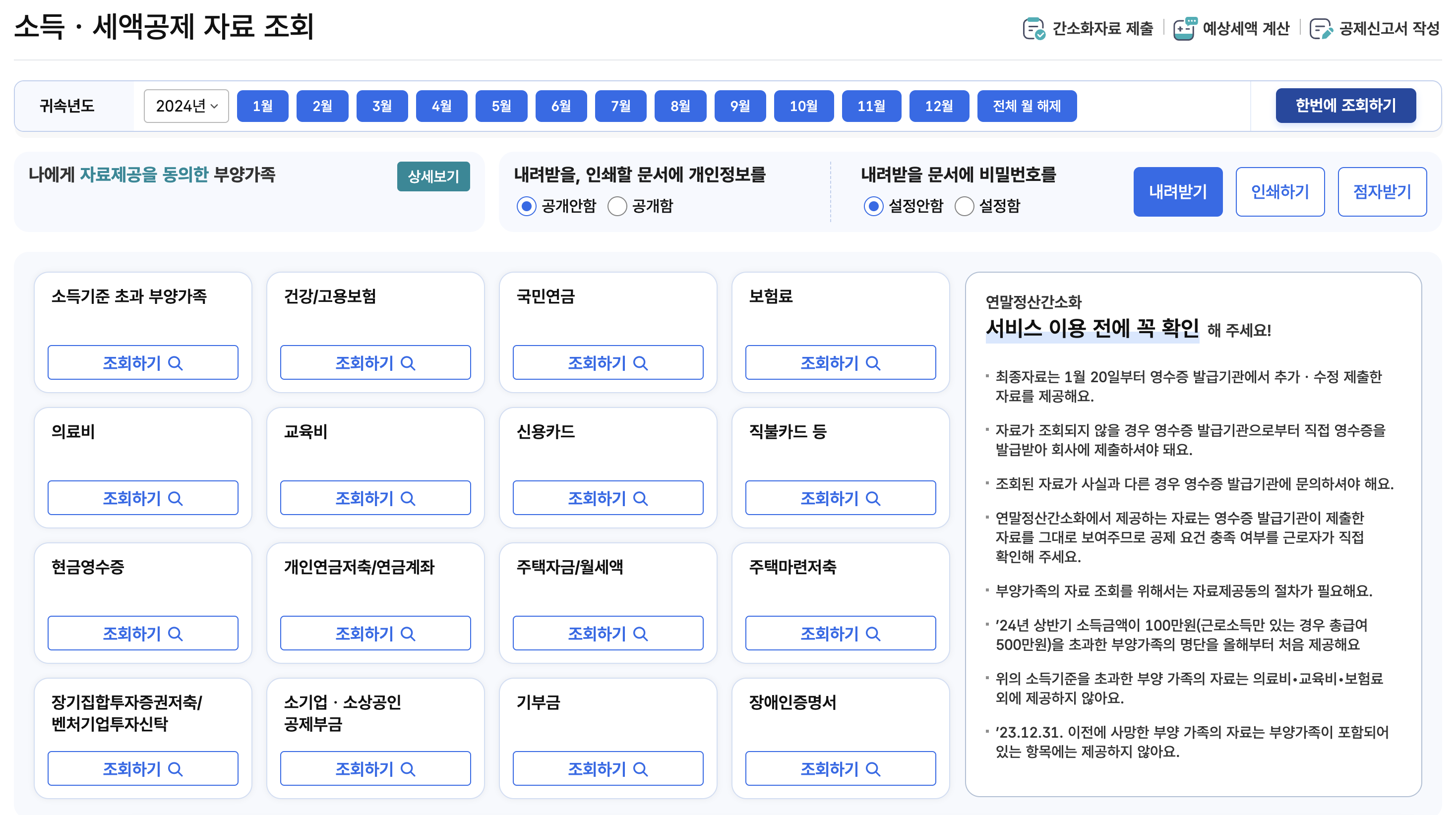 - 의료비, 교육비, 신용카드 사용 내역 등 소득공제 증빙 자료를 확인할 수 있습니다.