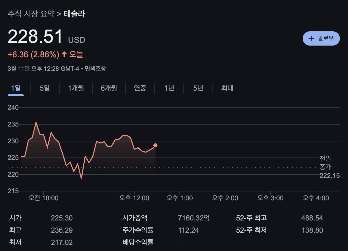 2025년 3월 11일, 테슬라(Tesla) 주가가 하루 만에 16.22% 폭락하며 시장에 충격을 주었다. 이는 2020년 9월 이후 최대 낙폭이며, 하루 만에 시가총액 약 1303억 달러(약 190조 원)가 증발하는 사태가 벌어졌다.